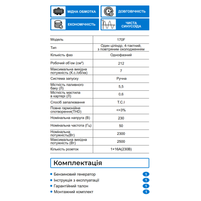 - Максимальна (пікова) потужність – 2.5 кВт.
